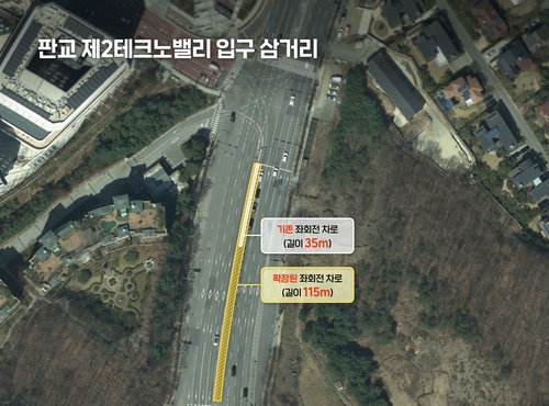 성남시(시장 신상진)는 판교 제2·3 테크노밸리 일대의 교통혼잡 해소를 위한 단기 교통개선 대책의 일환으로 시흥사거리의 분당∼내곡 방향 진출로에 대한 신호 운영을 개선하고, 제2테크노밸리 입구 삼거리의 좌회전 대기 차로를 기존 35m에서 115m로 대폭 연장했다고 2일 밝혔다.