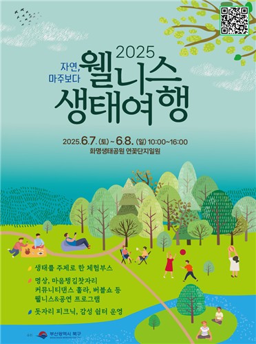 부산 북구(구청장 오태원)는 오는 6월 7일(토)부터 8일(일) 양일간 오전 10시부터 오후 4시까지 화명생태공원 연꽃단지 일원에서 자연을 느끼고, 생태를 배우며, 몸과 마음을 힐링할 수 있는 '웰니스 생태여행(부제: 자연 마주보다)' 행사를 개최한다고 밝혔다.